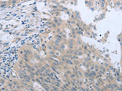 The image on the left is immunohistochemistry of paraffin-embedded Human ovarian cancer tissue using CSB-PA181605(TNK2 Antibody) at dilution 1/70, on the right is treated with synthetic peptide. (Original magnification: ×200)