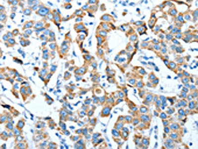 The image on the left is immunohistochemistry of paraffin-embedded Human breast cancer tissue using CSB-PA119248(TNNI3 Antibody) at dilution 1/20, on the right is treated with fusion protein. (Original magnification: ×200)