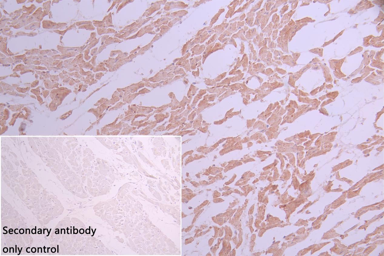 IHC image of CSB-PA024103ESR2HU diluted at 1:100 and staining in paraffin-embedded human Heart tissue performed on a Leica BondTM system. After dewaxing and hydration, antigen retrieval was mediated by high pressure in a citrate buffer (pH 6.0). Section was blocked with 10% normal goat serum 30min at RT. Then primary antibody (1% BSA) was incubated at 4°C overnight. The primary is detected by a Goat anti-rabbit polymer IgG labeled by HRP and visualized using 0.05% DAB. Secondary antibody only control: uses 1% BSA instead of primary antibody