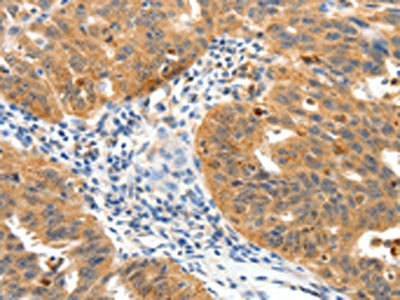 The image on the left is immunohistochemistry of paraffin-embedded Human gastric cancer tissue using CSB-PA362939(TPM2 Antibody) at dilution 1/25, on the right is treated with synthetic peptide. (Original magnification: ×200)