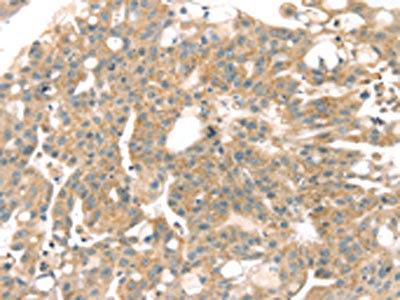 The image on the left is immunohistochemistry of paraffin-embedded Human breast cancer tissue using CSB-PA778095(TPST1 Antibody) at dilution 1/20, on the right is treated with synthetic peptide. (Original magnification: ×200)