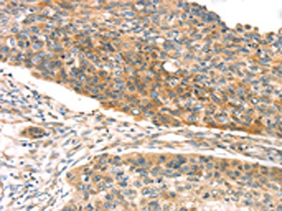 The image on the left is immunohistochemistry of paraffin-embedded Human esophagus cancer tissue using CSB-PA778095(TPST1 Antibody) at dilution 1/20, on the right is treated with synthetic peptide. (Original magnification: ×200)
