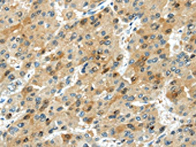 The image on the left is immunohistochemistry of paraffin-embedded Human liver cancer tissue using CSB-PA211960(TRIB1 Antibody) at dilution 1/20, on the right is treated with synthetic peptide. (Original magnification: ×200)