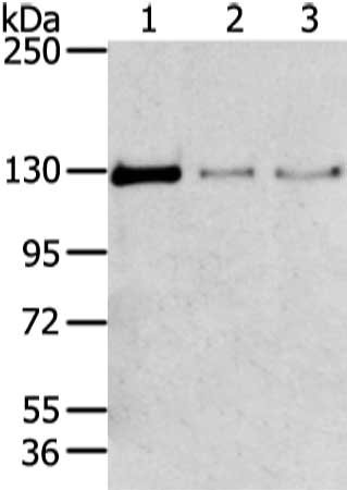 Gel: 6%SDS-PAGE, Lysate: 80 μg, Lane 1-3: 293T, 231 and lo2 cell, Primary antibody: CSB-PA197772(TRIM24 Antibody) at dilution 1/400 dilution, Secondary antibody: Goat anti rabbit IgG at 1/8000 dilution, Exposure time: 1 minute