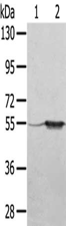 Gel: 8%SDS-PAGE, Lysate: 40 μg, Lane 1-2: A375 cells, human fetal muscle tissue, Primary antibody: CSB-PA192313(TRIM35 Antibody) at dilution 1/550, Secondary antibody: Goat anti rabbit IgG at 1/8000 dilution, Exposure time: 5 seconds