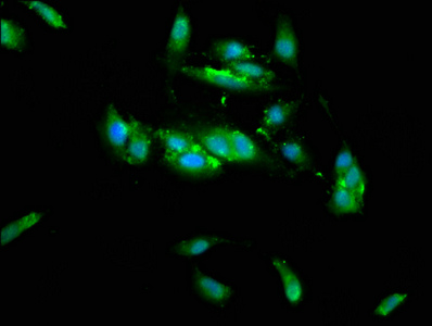 Immunofluorescence staining of Hela cells with CSB-PA892166LA01HU at 1:133, counter-stained with DAPI. The cells were fixed in 4% formaldehyde, permeabilized using 0.2% Triton X-100 and blocked in 10% normal Goat Serum. The cells were then incubated with the antibody overnight at 4°C. The secondary antibody was Alexa Fluor 488-congugated AffiniPure Goat Anti-Rabbit IgG(H+L).
