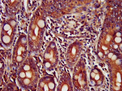 IHC image of CSB-PA892166LA01HU diluted at 1:400 and staining in paraffin-embedded human small intestine tissue performed on a Leica BondTM system. After dewaxing and hydration, antigen retrieval was mediated by high pressure in a citrate buffer (pH 6.0). Section was blocked with 10% normal goat serum 30min at RT. Then primary antibody (1% BSA) was incubated at 4°C overnight. The primary is detected by a biotinylated secondary antibody and visualized using an HRP conjugated SP system.