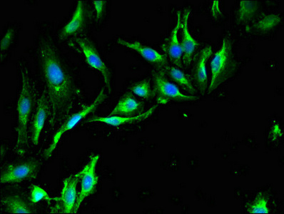 Immunofluorescent analysis of Hela cells using CSB-PA881029LA01HU at dilution of 1:100 and Alexa Fluor 488-congugated AffiniPure Goat Anti-Rabbit IgG(H+L)