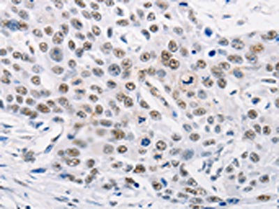 The image on the left is immunohistochemistry of paraffin-embedded Human esophagus cancer tissue using CSB-PA168065(TRIM63 Antibody) at dilution 1/60, on the right is treated with synthetic peptide. (Original magnification: ×200)