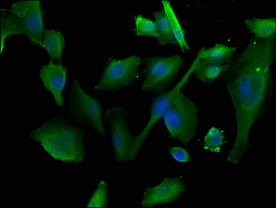 Immunofluorescence staining of U251 cells with CSB-PA750884LA01HU at 1:50, counter-stained with DAPI. The cells were fixed in 4% formaldehyde, permeabilized using 0.2% Triton X-100 and blocked in 10% normal Goat Serum. The cells were then incubated with the antibody overnight at 4°C. The secondary antibody was Alexa Fluor 488-congugated AffiniPure Goat Anti-Rabbit IgG(H+L).