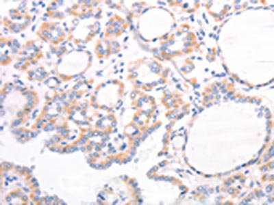The image on the left is immunohistochemistry of paraffin-embedded Human thyroid cancer tissue using CSB-PA954426(TRPC7 Antibody) at dilution 1/25, on the right is treated with fusion protein. (Original magnification: ×200)