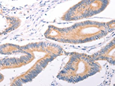 The image on the left is immunohistochemistry of paraffin-embedded Human colon cancer tissue using CSB-PA954426(TRPC7 Antibody) at dilution 1/25, on the right is treated with fusion protein. (Original magnification: ×200)