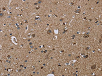 The image on the left is immunohistochemistry of paraffin-embedded Human brain tissue using CSB-PA227659(TRPM1 Antibody) at dilution 1/20, on the right is treated with synthetic peptide. (Original magnification: ×200)