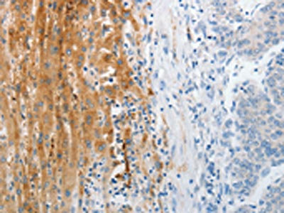 The image on the left is immunohistochemistry of paraffin-embedded Human liver cancer tissue using CSB-PA244928(TRPM1 Antibody) at dilution 1/30, on the right is treated with synthetic peptide. (Original magnification: ×200)
