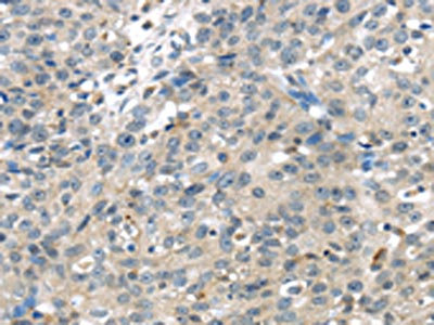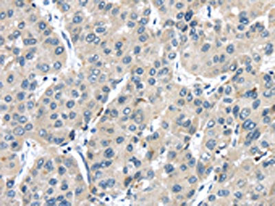 The image on the left is immunohistochemistry of paraffin-embedded Human liver cancer tissue using CSB-PA113579(TRPM2 Antibody) at dilution 1/25, on the right is treated with fusion protein. (Original magnification: ×200)