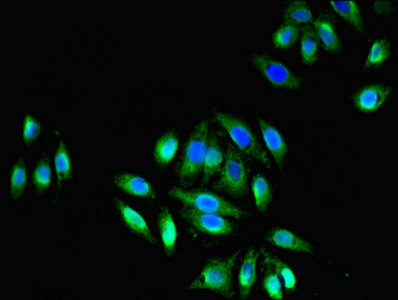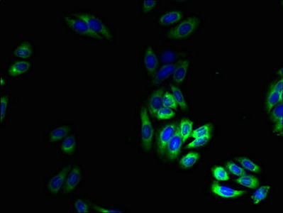 Immunofluorescent analysis of HepG2 cells using CSB-PA007779LA01HU at dilution of 1:100 and Alexa Fluor 488-congugated AffiniPure Goat Anti-Rabbit IgG(H+L)