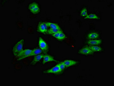 Immunofluorescent analysis of Hela cells using CSB-PA007779LA01HU at dilution of 1:100 and Alexa Fluor 488-congugated AffiniPure Goat Anti-Rabbit IgG(H+L)