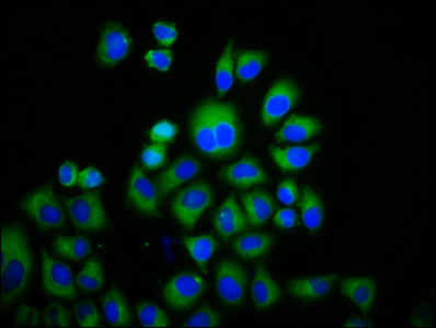 Immunofluorescence staining of Hela cells with CSB-PA884520LA01HU at 1:133, counter-stained with DAPI. The cells were fixed in 4% formaldehyde, permeabilized using 0.2% Triton X-100 and blocked in 10% normal Goat Serum. The cells were then incubated with the antibody overnight at 4°C. The secondary antibody was Alexa Fluor 488-congugated AffiniPure Goat Anti-Rabbit IgG(H+L).