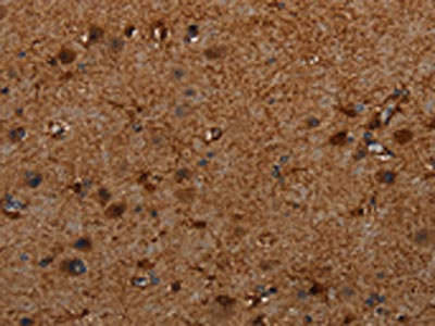 The image on the left is immunohistochemistry of paraffin-embedded Human brain tissue using CSB-PA037727(TRPV1 Antibody) at dilution 1/20, on the right is treated with synthetic peptide. (Original magnification: ×200)