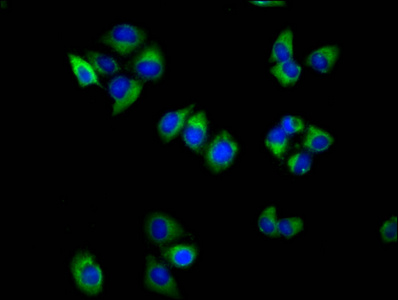 Immunofluorescence staining of Hela cells with CSB-PA853503LA01HU at 1:100, counter-stained with DAPI. The cells were fixed in 4% formaldehyde, permeabilized using 0.2% Triton X-100 and blocked in 10% normal Goat Serum. The cells were then incubated with the antibody overnight at 4°C. The secondary antibody was Alexa Fluor 488-congugated AffiniPure Goat Anti-Rabbit IgG(H+L).