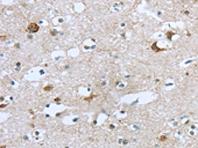 The image on the left is immunohistochemistry of paraffin-embedded Human brain tissue using CSB-PA068526(TTBK1 Antibody) at dilution 1/35, on the right is treated with synthetic peptide. (Original magnification: ×200)