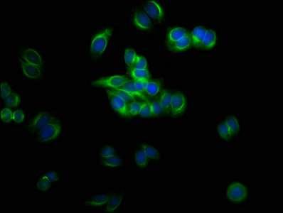 Immunofluorescent analysis of HepG2 cells using CSB-PA03879A0Rb at dilution of 1:100 and Alexa Fluor 488-congugated AffiniPure Goat Anti-Rabbit IgG(H+L)