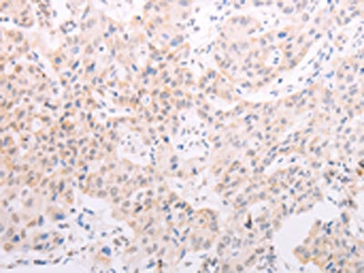 The image on the left is immunohistochemistry of paraffin-embedded Human lung cancer tissue using CSB-PA986893(TYR Antibody) at dilution 1/30, on the right is treated with fusion protein. (Original magnification: ×200)