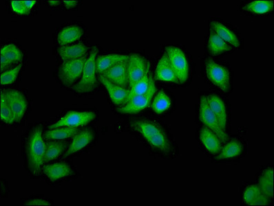 Immunofluorescence staining of HepG2 cells with CSB-PA23029A0Rb at 1:66, counter-stained with DAPI. The cells were fixed in 4% formaldehyde, permeabilized using 0.2% Triton X-100 and blocked in 10% normal Goat Serum. The cells were then incubated with the antibody overnight at 4°C. The secondary antibody was Alexa Fluor 488-congugated AffiniPure Goat Anti-Rabbit IgG(H+L).