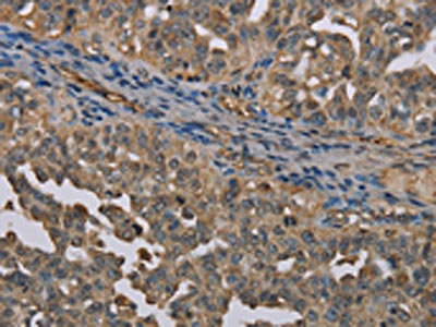 The image on the left is immunohistochemistry of paraffin-embedded Human ovarian cancer tissue using CSB-PA271355(UBP1 Antibody) at dilution 1/40, on the right is treated with synthetic peptide. (Original magnification: ×200)