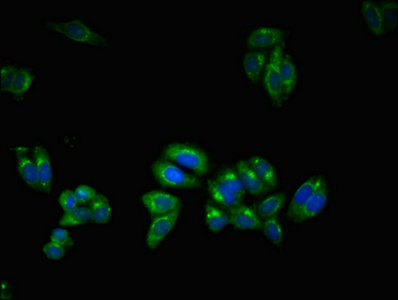 Immunofluorescent analysis of HepG2 cells using CSB-PA883393LA01HU at dilution of 1:100 and Alexa Fluor 488-congugated AffiniPure Goat Anti-Rabbit IgG(H+L)