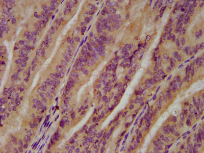 IHC image of CSB-PA025579LA01HU diluted at 1:200 and staining in paraffin-embedded human endometrial cancer performed on a Leica BondTM system. After dewaxing and hydration, antigen retrieval was mediated by high pressure in a citrate buffer (pH 6.0). Section was blocked with 10% normal goat serum 30min at RT. Then primary antibody (1% BSA) was incubated at 4°C overnight. The primary is detected by a biotinylated secondary antibody and visualized using an HRP conjugated SP system.