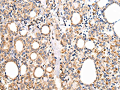 The image on the left is immunohistochemistry of paraffin-embedded Human thyroid cancer tissue using CSB-PA066975(UQCRC1 Antibody) at dilution 1/20, on the right is treated with fusion protein. (Original magnification: ×200)