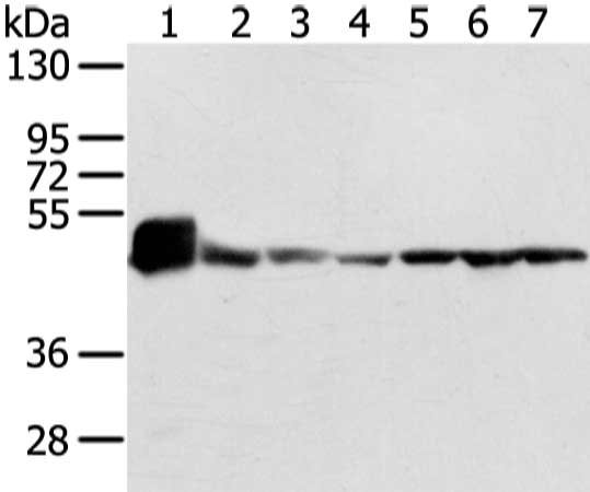 Gel: 8%SDS-PAGE, Lysate: 40 μg, Lane 1-7: Mouse heart tissue and lo2 cell, 231 cell and human fetal brain tissue, A431, hela and 293T cell, Primary antibody: CSB-PA066975(UQCRC1 Antibody) at dilution 1/200 dilution, Secondary antibody: Goat anti rabbit IgG at 1/8000 dilution, Exposure time: 1 second