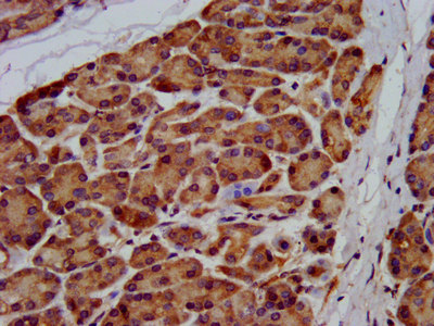 IHC image of CSB-PA890777LA01HU diluted at 1:200 and staining in paraffin-embedded human pancreatic tissue performed on a Leica BondTM system. After dewaxing and hydration, antigen retrieval was mediated by high pressure in a citrate buffer (pH 6.0). Section was blocked with 10% normal goat serum 30min at RT. Then primary antibody (1% BSA) was incubated at 4°C overnight. The primary is detected by a biotinylated secondary antibody and visualized using an HRP conjugated SP system.