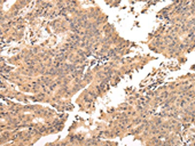 The image on the left is immunohistochemistry of paraffin-embedded Human colorectal cancer tissue using CSB-PA693911(USP45 Antibody) at dilution 1/25, on the right is treated with fusion protein. (Original magnification: ×200)