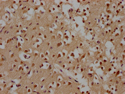 IHC image of CSB-PA897542LA01HU diluted at 1:100 and staining in paraffin-embedded human brain tissue performed on a Leica BondTM system. After dewaxing and hydration, antigen retrieval was mediated by high pressure in a citrate buffer (pH 6.0). Section was blocked with 10% normal goat serum 30min at RT. Then primary antibody (1% BSA) was incubated at 4°C overnight. The primary is detected by a biotinylated secondary antibody and visualized using an HRP conjugated SP system.