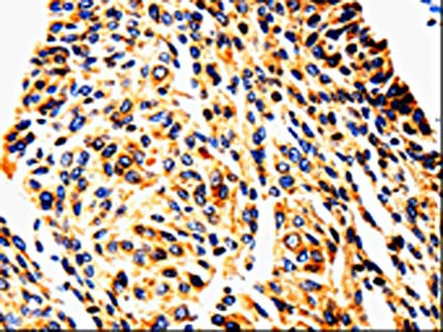 The image is immunohistochemistry of paraffin-embedded Human cervical cancer tissue using CSB-PA070871(UTS2 Antibody) at dilution 1/50. (Original magnification: ×200)