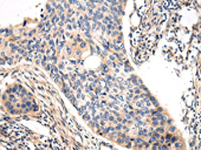 The image on the left is immunohistochemistry of paraffin-embedded Human esophagus cancer tissue using CSB-PA899191(VASH1 Antibody) at dilution 1/20, on the right is treated with fusion protein. (Original magnification: ×200)