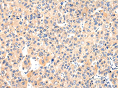 The image on the left is immunohistochemistry of paraffin-embedded Human liver cancer tissue using CSB-PA562311(VASH1 Antibody) at dilution 1/25, on the right is treated with fusion protein. (Original magnification: ×200)