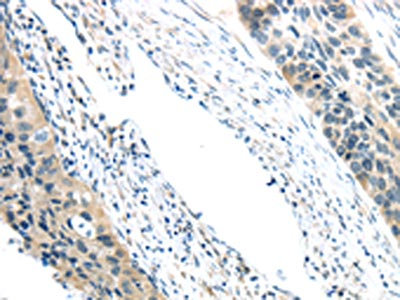 The image on the left is immunohistochemistry of paraffin-embedded Human esophagus cancer tissue using CSB-PA980886(VGF Antibody) at dilution 1/35, on the right is treated with synthetic peptide. (Original magnification: ×200)