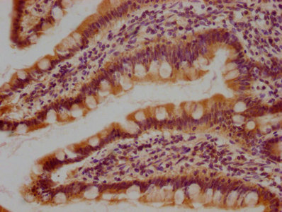IHC image of CSB-PA801240OA01HU diluted at 1:100 and staining in paraffin-embedded human small intestine tissue performed on a Leica BondTM system. After dewaxing and hydration, antigen retrieval was mediated by high pressure in a citrate buffer (pH 6.0). Section was blocked with 10% normal goat serum 30min at RT. Then primary antibody (1% BSA) was incubated at 4°C overnight. The primary is detected by a biotinylated secondary antibody and visualized using an HRP conjugated SP system.