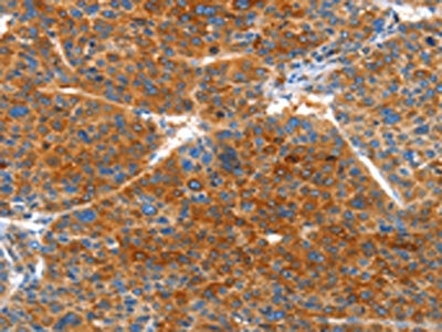The image on the left is immunohistochemistry of paraffin-embedded Human liver cancer tissue using CSB-PA577110(VWA5A Antibody) at dilution 1/60, on the right is treated with fusion protein. (Original magnification: ×200)