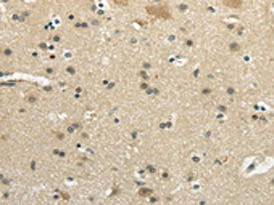The image on the left is immunohistochemistry of paraffin-embedded Human brain tissue using CSB-PA992576(WNK2 Antibody) at dilution 1/35, on the right is treated with synthetic peptide. (Original magnification: ×200)