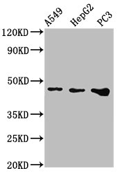 Positive WB detected in: A549 whole cell lysate, HepG2 whole cell lysate, PC-3 whole cell lysate