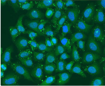 Immunofluorescence staining of U2OS cells with CSB-PA026183KA01HU at 1:100, counter-stained with DAPI. The cells were fixed in 4% formaldehyde, permeabilized using 0.2% Triton X-100 and blocked in 10% normal Goat Serum. The cells were then incubated with the antibody overnight at 4°C. The secondary antibody was Alexa Fluor 488-congugated AffiniPure Goat Anti-Rabbit IgG(H+L).