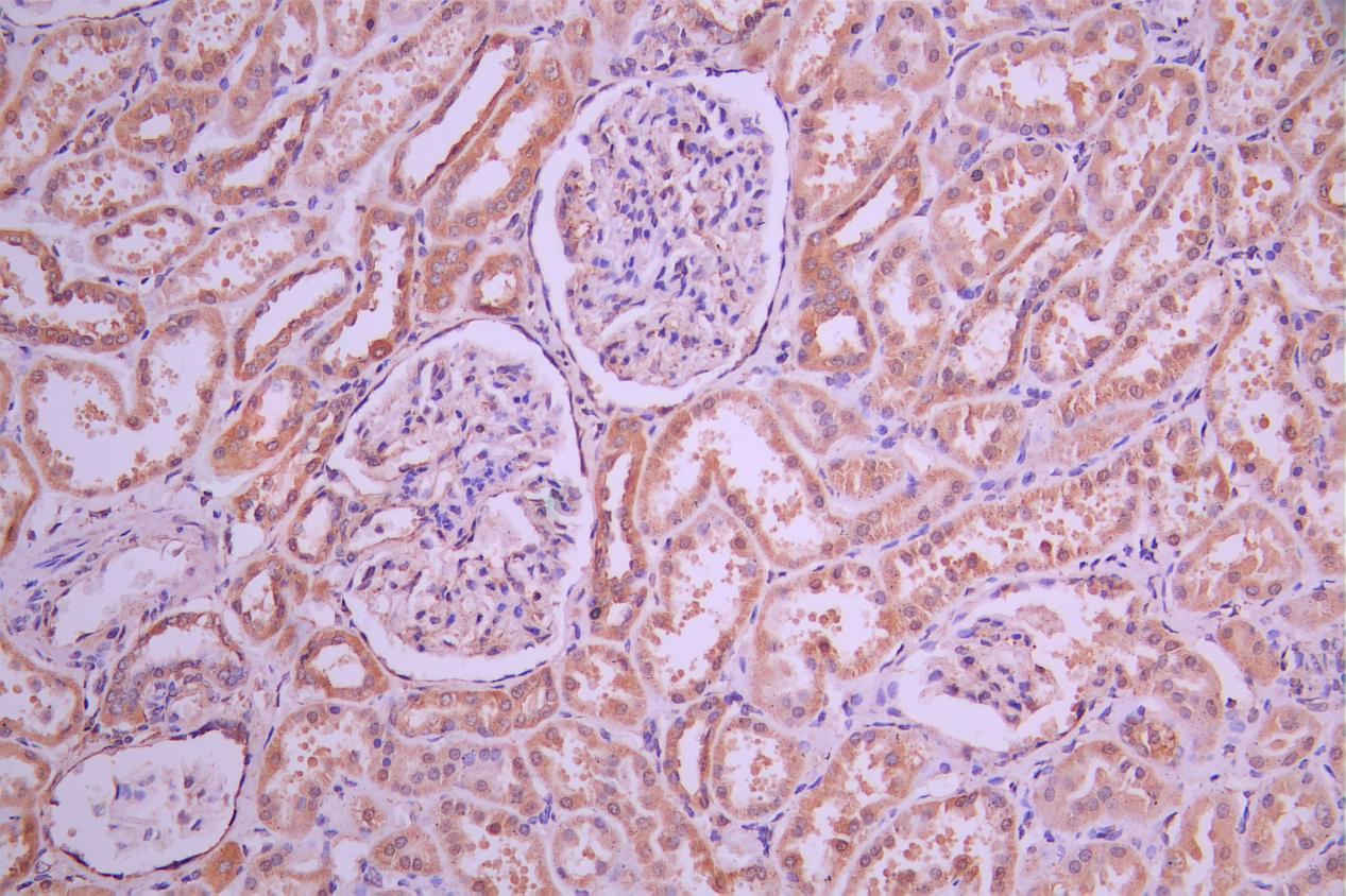 IHC image of CSB-PA822219LA01HU diluted at 1:50 and staining in paraffin-embedded human kidney tissue performed on a Leica BondTM system. After dewaxing and hydration, antigen retrieval was mediated by high pressure in a citrate buffer (pH 6.0). Section was blocked with 10% normal goat serum 30min at RT. Then primary antibody (1% BSA) was incubated at 4°C overnight. The primary is detected by a Goat anti-rabbit polymer IgG labeled by HRP and visualized using 0.05% DAB.