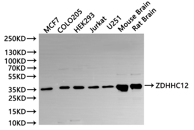 Positive WB detected in: MCF7 whole cell lysate(30μg), COLO205 whole cell lysate(30μg) , HEK293 whole cell lysate(30μg), Jurkat whole cell lysate(30μg), U251 whole cell lysate(30μg), Mouse brain tissue lysate(30μg), Rat brain tissue lysate(30μg)