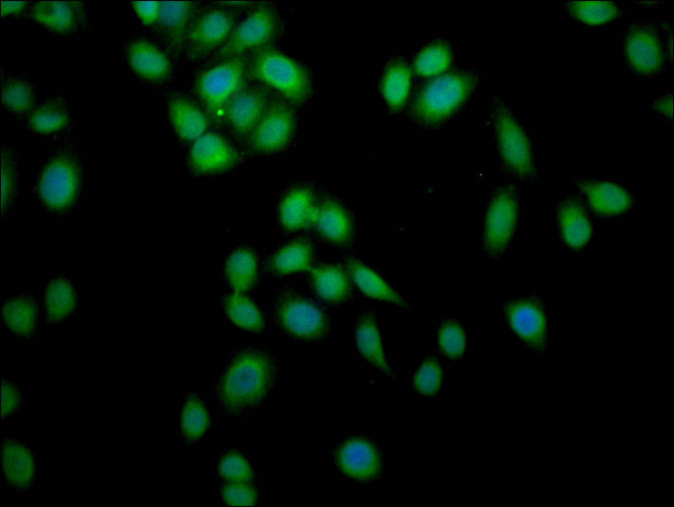 Immunofluorescence staining of Hela cells with CSB-PA861122LA01HU at 1:200, counter-stained with DAPI.The cells were fixed in 4% formaldehyde, permeated by 0.2% TritonX-100, and blocked in 10% normal Goat Serum. The cells were then incubated with the antibody overnight at 4°C. Nuclear DNA was labeled in blue with DAPI. The secondary antibody was Alexa Fluor 488-congugated AffiniPure Goat Anti-Rabbit IgG(H+L)