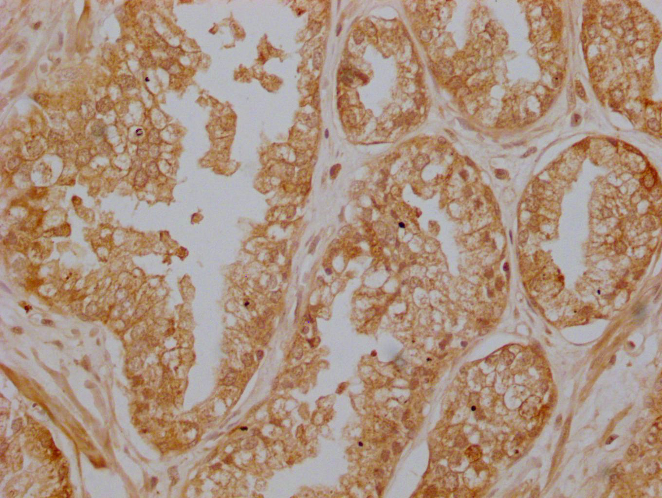 IHC image of CSB-PA861122LA01HU diluted at 1:200 and staining in paraffin-embedded human prostate cancer performed on a Leica BondTM system. After dewaxing and hydration, antigen retrieval was mediated by high pressure in a citrate buffer (pH 6.0). Section was blocked with 10% normal goat serum 30min at RT. Then primary antibody (1% BSA) was incubated at 4°C overnight. The primary is detected by a Goat anti-rabbit polymer IgG labeled by HRP and visualized using 0.05% DAB.