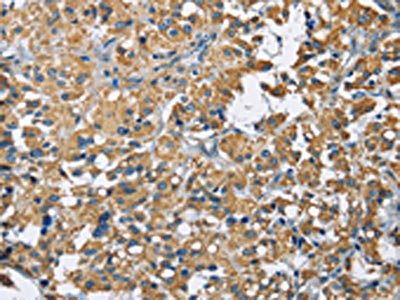 The image on the left is immunohistochemistry of paraffin-embedded Human thyroid cancer tissue using CSB-PA579260(ZMYND11 Antibody) at dilution 1/70, on the right is treated with fusion protein. (Original magnification: ×200)